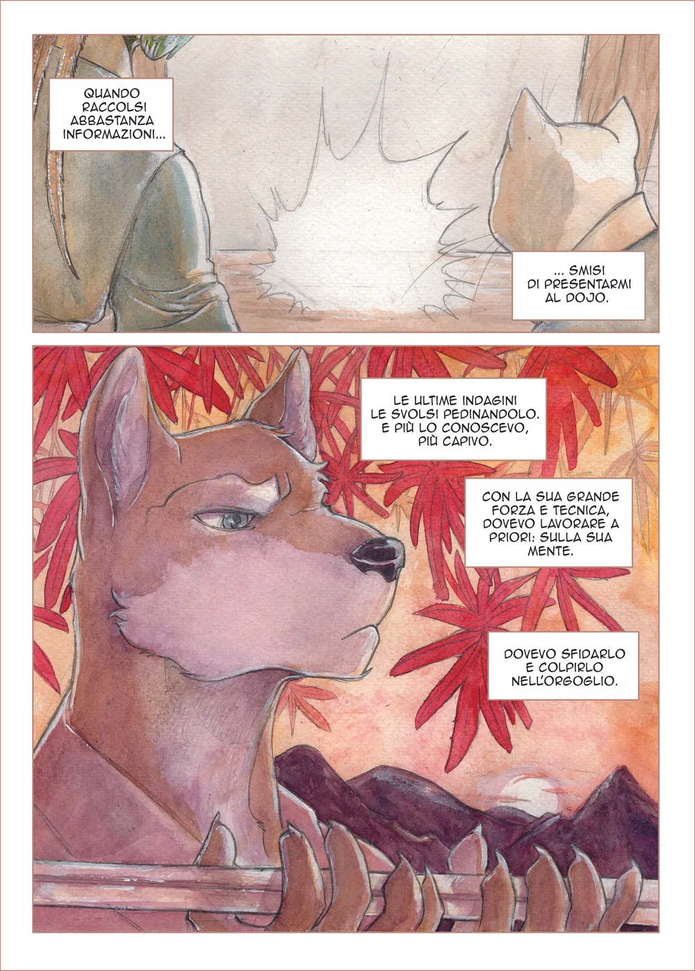 Ci sono tecniche che ritengo più naturali da applicare a mano ed altre al pc anche se considero manuale e digitale mai del tutto separati. Se da un lato trovo piacevole, addirittura rilassante, stendere l’acquarello, dal canto suo ha tutti i difetti del manuale: gli errori sono sempre un problema e si rischia di dover buttare una tavola per uno schizzo d’acqua impossibile da correggere. Nonostante ciò, mi è difficile recuperare a digitale quella naturalezza che ottengo con i pennelli, e l’impaginazione delle vignette, i balloon e il lettering per me sono fattibili solo attraverso il computer.