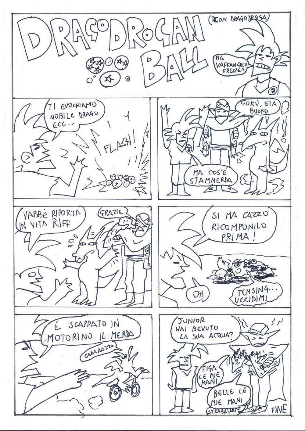 Dietro il nome di Fumetti Sbagliati si “nasconde” Riccardo Ronchi, creatore dei personaggi di Drago Droga e di Grifone Ingrifone, oltre che che Batuomo e Robino. Noi di Mecenate Povero scoprimmo questo autore durante il Piccolo Festival del Fumetto di Cremona del 2020, in occasione del quale venne allestita una mostra proprio dedicata a Drago Droga, e comprammo subito l’albo Drago Droga e Grifone Ingrifone, stampato da Slow Comix, per la nostra Collezione. Come riassumere l’opera di Fumetti Sbagliati? Citando un articolo di Carlotta Vacchelli che vi consigliamo di leggere, “il cazzo va chiamato cazzo, e la merda, merda”. Per il resto, vi lasciamo alla scoperta di Fumetti Sbagliati con il suo profilo Instagram.